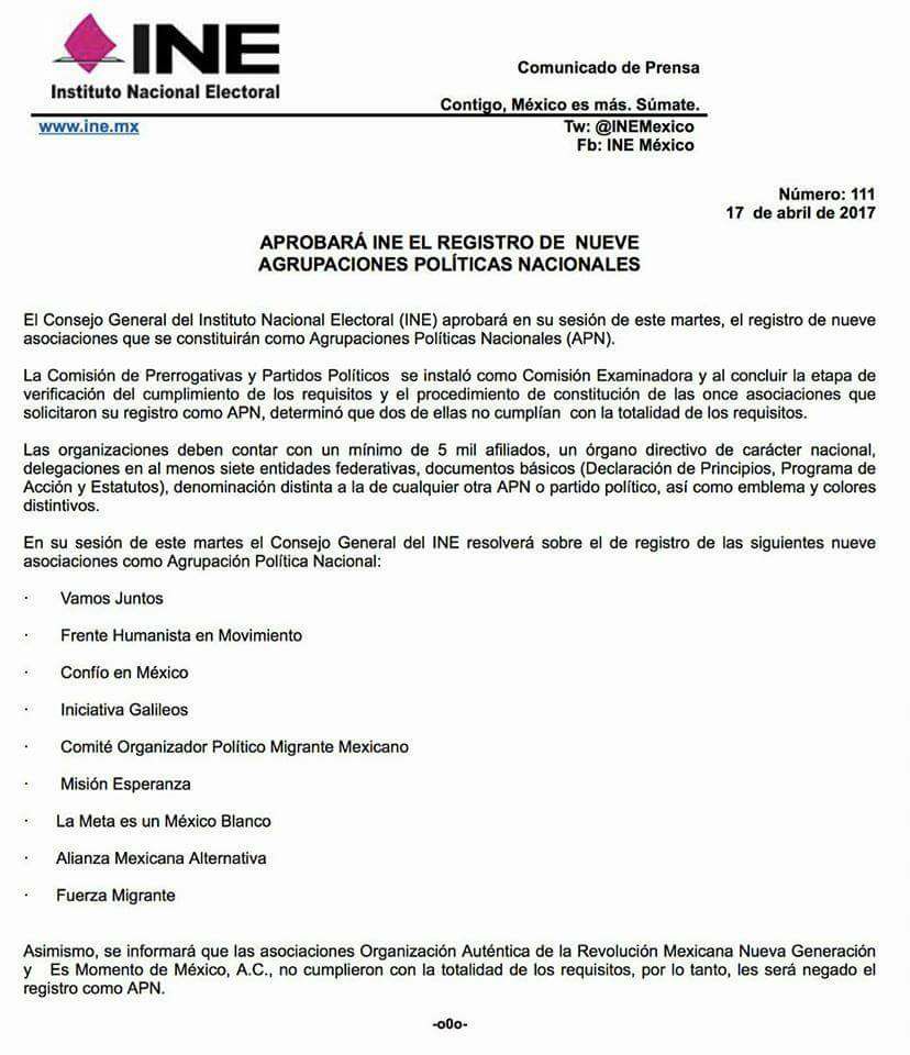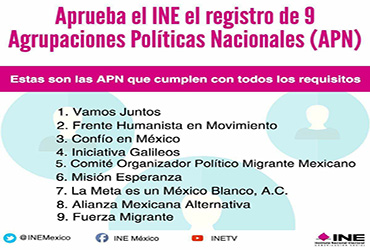 El Consejo General del Instituto Nacional Electoral (INE) en su sesión del 18 de abril del 2017, aprobó el registro de nueve asociaciones que se constituirán como Agrupaciones Políticas Nacionales (APN).